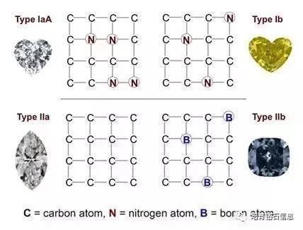 这里我们需要科普一些专业知识,钻石分为四种类型,分别是Type IaA(原子结构里含有氮元素),Type Ib(含有不规则排列的氮元素),Type IIa(纯净碳元素),Type IIb(含有硼元素,一般的蓝色钻石的致色原因)